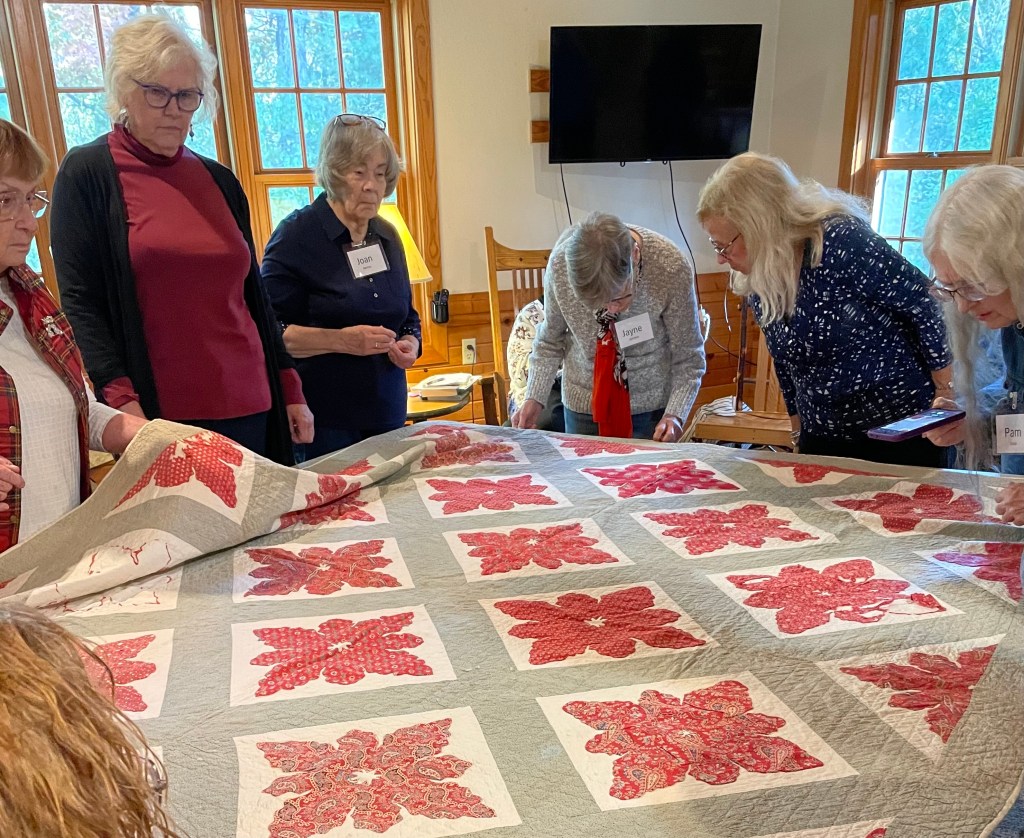 Our 2024 Retreat was fantastic! Even the weather cooperated as 20 of us gathered at Mount Morris in mid-October. How lucky can we be to have our presenter Carol Butzke as part of our group?! Carol brought a wealth of fabric & quilts and presented them in quarter centuries starting in 1825 and going up to 1950. Besides the material treasures, Carol provided us with written copies of the history and trends from each of the quarter centuries. To quote attendee Ebie Morris, “It’s comparable to going to multiple museums and seeing several centuries of …great textiles.”