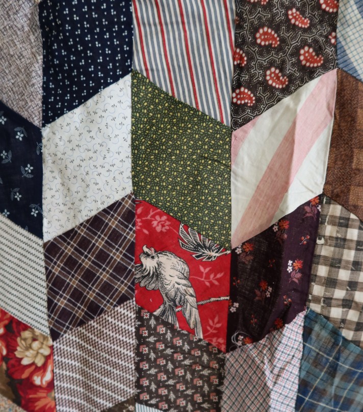 Yesterday I attended a wonderful presentation by Leah Zieber. She focused on the fabrics included in one quilt in her collection, a pieced hexagon quilt ca. 1825. Leah did a terrific job of breaking the components into subsets such as indigo, green, yellow, and white. She showed many examples of each, augmenting the fabrics in her piece with images of antique swatch books she was able to view on a research trip to England.